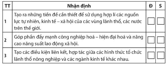 Những nhận định sau đây về vai trò của tổ chức lãnh thổ nông nghiệp là đúng (Đ) hay sai (S)? Hãy đánh dấu (X) vào các ô tương ứng bên cạnh mỗi nhận định