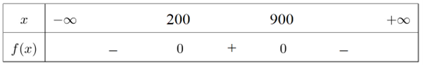 \(f\left( x \right) = - {x^2} + 1\;100x - 180\;000\)có hai nghiệm \({x_1} = 200;{x_2} = 900\) và có hệ số \(a = - 1 < 0\)