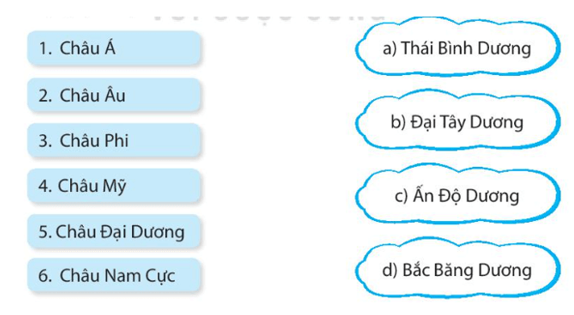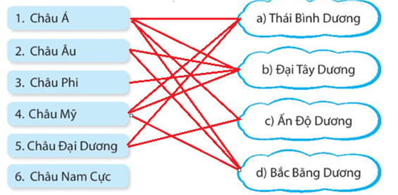 Quan sát hình 2 trang 111 (SGK) và nối từng châu lục với các đại dương tiếp giáp cho phù hợp.