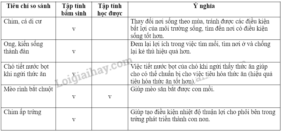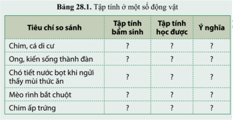 Luyện tập 1. Cho biết những tập tính có trong bảng 28.1 là tập tính bẩm sinh hay tập tính học được. Nêu ý nghĩa của các tập tính đó đối với động vật.