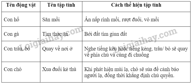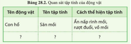 Thực hành 1. Tìm hiểu một số tập tính của động vật: - Quan sát tập tính của một loài động vật có ở địa phương em hoặc xem video về tập tính của động vật. - Ghi chép thông tin hoặc hình ảnh về tập tính của động vật quan sát được theo mẫu bảng 28.2. - Trình bày kết quả quan sát được.