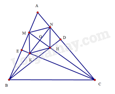 Cho tam giác \(ABC\) nhọn có các đường cao \(BD,CE\). Tia phân giác của các góc \(ACE,ABD\) cắt nhau tại \(O\) và cắt \(AB,AC\) lần lượt tại \(M,N\). Tia \(BN\) cắt \(CE\) tại \(K\), tia \(CM\) cắt \(BD\) tại \(H\). Chứng minh: