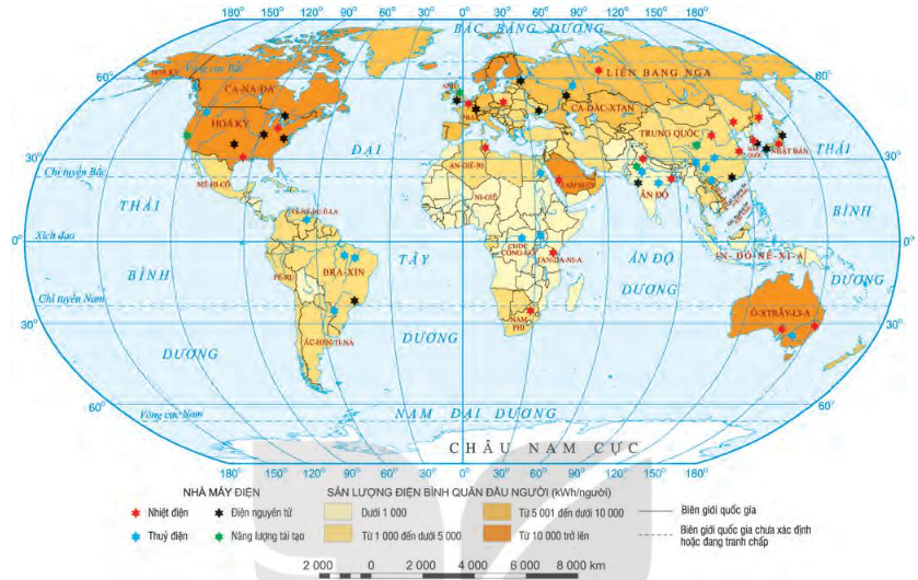 Các nước trên thế giới có sản lượng điện bình quân trên đầu người từ 10000 kWh/người trở lên năm 2019 là Hoa Kỳ, Ca-na-đa, Ả-rập Xê-út, Ô-xtray-lia,…