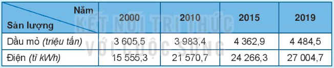 Trong giai đoạn 2000 – 2019, sản lượng dầu mỏ và điện của thế giới đều tăng liên tục: