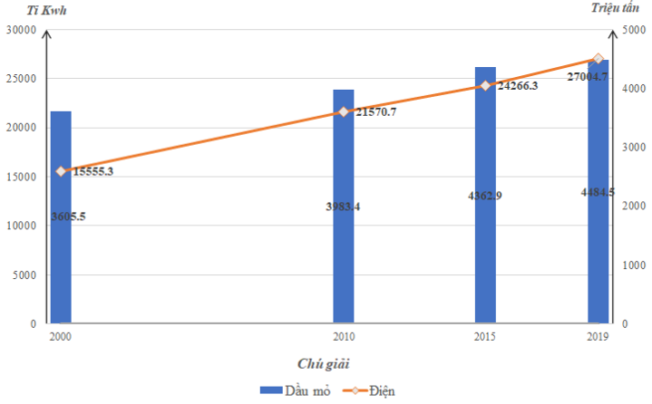 + Điện năm 2000 đạt 15555,3 tỉ Kwh -> năm 2010 đạt 21570,7 tỉ Kwh -> năm 2019 đạt 27004,7 tỉ Kwh.
