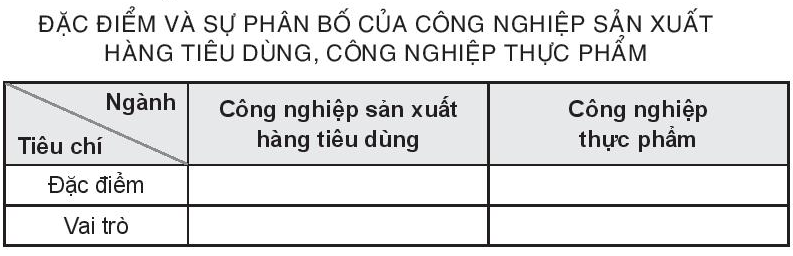 Đọc lại kiến thức về vai trò và đặc điểm của 2 ngành Công nghiệp sản xuất hàng tiêu dùng và công nghiệp thực phẩm.