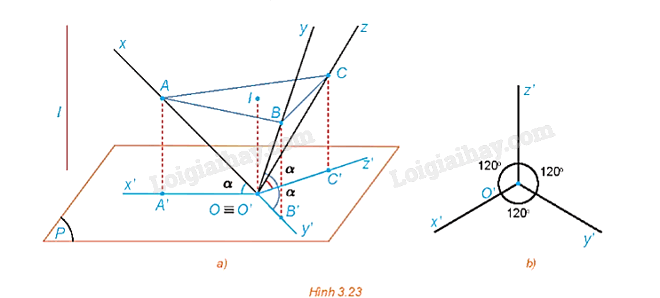 Trong HĐ7, bằng cách xét tam giác vuông OIA và tính tỉ số \(\frac{{IA}}{{OA}}\) , chứng minh rằng trong phép chiếu trục đo vuông góc đều thì \(p = q = r = \frac{{\sqrt 6 }}{3}\).