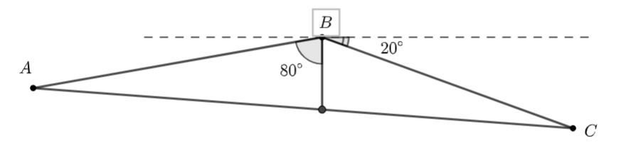 Xét \(\Delta ABC\) có \(\widehat B = {80^ \circ } + \left( {{{90}^ \circ } - {{20}^ \circ }} \right) = {150^ \circ }.\)