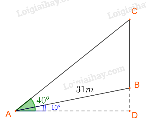 Khi đó ta có: \( \widehat {BAD} = {10^ \circ },\, \widehat {CAD} = {40^ \circ }\) và \(AB=31m\)