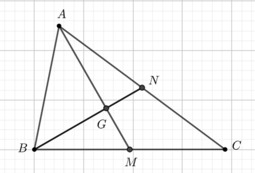\(\begin{array}{l}{c^2} = A{B^2} = A{G^2} + B{G^2}\\{c^2} = {\left( {\frac{2}{3}AM} \right)^2} + {\left( {\frac{2}{3}BN} \right)^2}\\{c^2} = \frac{4}{9}\left( {\frac{{{b^2} + {c^2}}}{2} - \frac{{{a^2}}}{4}} \right) + \frac{4}{9}\left( {\frac{{{a^2} + {c^2}}}{2} - \frac{{{b^2}}}{4}} \right)\\{c^2} = \frac{4}{9}\left( {\frac{{{a^2} + {b^2} + 2{c^2}}}{2} - \frac{{{a^2} + {b^2}}}{4}} \right)\\{c^2} = \frac{4}{9}.\frac{{{a^2} + {b^2} + 4{c^2}}}{4}\\ \Leftrightarrow \,\,9{c^2} = {a^2} + {b^2} + 4{c^2}\\ \Leftrightarrow \,\,{a^2} + {b^2} = 5{c^2}\,\,\left( {dpcm} \right)\end{array}\)