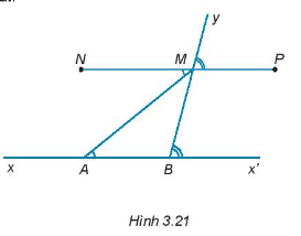 Cho đường thẳng xx’, điểm A thuộc xx’. Trên tia Ax’ lấy điểm B (điểm B khác điểm A). Vẽ tia By, trên tia By lấy điểm M. Hai điểm N và P thoả mãn \(\widehat {NMA} = \widehat {MAB};\widehat {PMy} = \widehat {MBx'}\) (H.3.21). Giải thích tại sao ba điểm N, M, P thẳng hàng.
