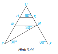 b) Vì \(\widehat {DKH} = \widehat {DFE}( = 60^\circ )\), mà 2 góc này ở vị trí đồng vị nên HK//EF ( Dấu hiệu nhận biết 2 đường thẳng song song.)