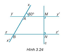 b) Vì \(yy'\parallel zz' \) nên \(\widehat {xAM} = \widehat {ABN} = {60^\circ }\) (hai góc đồng vị)