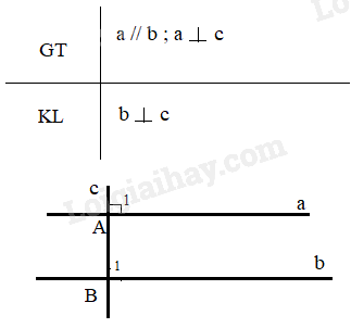 Giả sử cho 2 đường thẳng song song a và b, đường thẳng c vuông góc với a. Ta phải chứng minh c cũng vuông góc với b. Thật vậy: