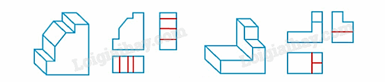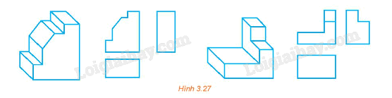 Trên hình chiếu của mỗi vật thể (H.3.27) còn thiếu một số nét. Bổ sung các nét còn thiếu đó.