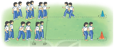 - Bước 2: Các em chia thành hai đội xếp hàng dọc (mỗi đội hai hàng) đứng sau vạch chuẩn bị, trong mỗi đội hai em nắm tay nhau thành ột cặp. Cặp đầu hàng đứng sau vạch xuất phát thẳng hướng vật đích.