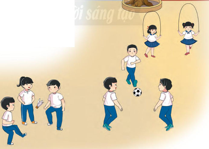 1. Các bạn trong tranh đang vui chơi trên sân trường: nhảy dây, đá bóng, đá cầu