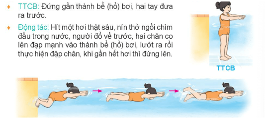 - TTCB: Nằm sấp trên thành bể (hồ) bơi, thân người và bụng nằm ở trên; đùi và chân ở dưới nước; duỗi thẳng chân.