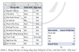 Trong Excel, hãy nhập bảng dữ liệu như ở Hình 1a. Từ đó, hãy tạo bảng tổng hợp như Hình 1b để đếm số học sinh theo từng mức xếp loại.