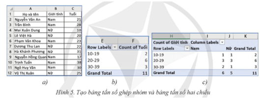 2) Tạo bảng thống kê số lượng học sinh theo tuổi và giới tính. Nói cách khác, cần tạo bằng tần số theo tuổi được ghép nhóm hai chiều: Tuổi (với khoảng là 10) và Giới tính (để tách riêng cho Nam và Nữ). Kết quả nhận được như Hình 5c.