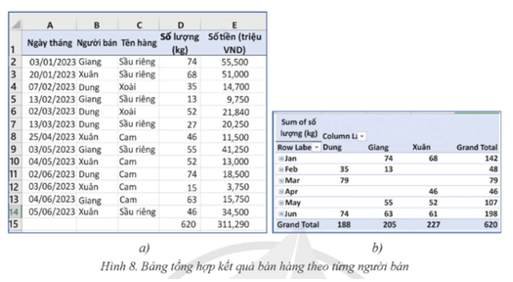Cho bảng dữ liệu gồm các cột: Ngày tháng, Người bán, Tên hàng, Số lượng, Số tiền (Hình 8a).