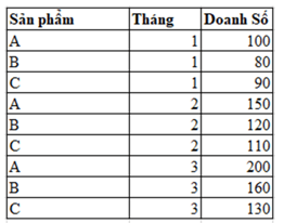 Giả sử bạn có một bảng dữ liệu về doanh số bán hàng với các trường "Sản phẩm", "Tháng" và "Doanh số".
