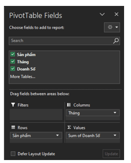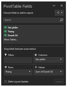 - Nếu kéo "Tháng" vào vùng ROWS và "Sản phẩm" vào vùng COLUMNS: