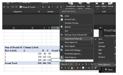 Nhấp chuột phải vào bất kỳ giá trị nào trong trường này trong PivotTable. Chọn "Summarize Values By" > "Sum".