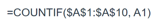 là phạm vi dữ liệu của bạn và A1 là ô mà bạn đang kiểm tra trong phạm vi đó. Hàm COUNTIF sẽ đếm số lần mà giá trị trong ô A1 xuất hiện trong phạm vi .