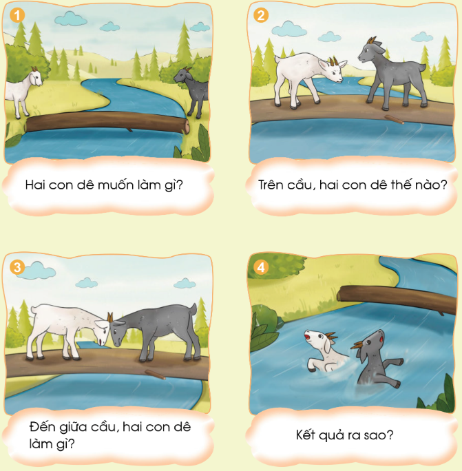 Tranh 1: Hai con dê cùng muốn đi qua một chiếc cầu hẹp bắc ngang một dòng suối nhỏ.