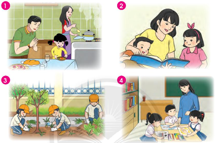 Tranh 1: Bức tranh có bố, mẹ và bạn nhỏ. Họ đang cùng nhau nấu cơm. Em rất thích việc đó.