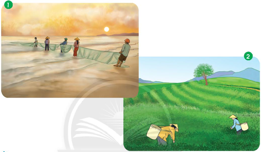 - Tranh 1: Mọi người đang kéo lưới đánh cá. Việc đó diễn ra ở biển. Em đặt tên cho bức tranh là “Tự hào biển quê hương”.