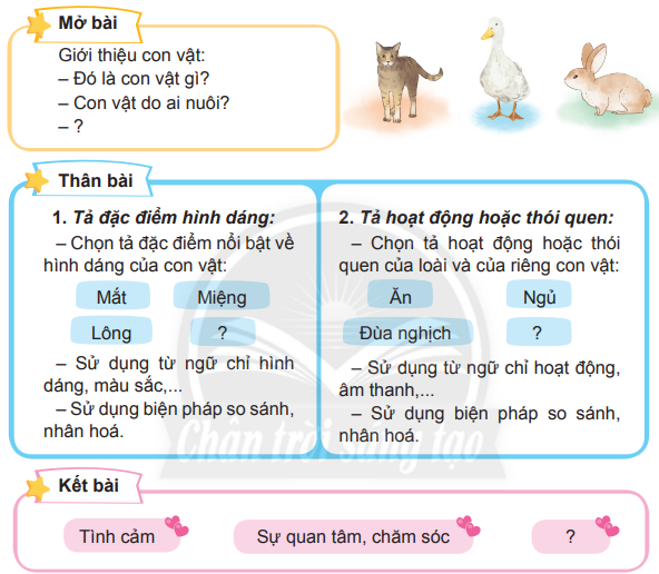 Dựa vào bài tập 2 trang 87 (Tiếng Việt 4, tập hai), lập dàn ý cho bài văn miêu tả một con vật nuôi trong nhà mà em thích.
