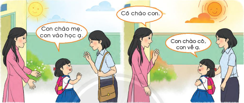 Trong tranh có cô giáo, mẹ và bạn nhỏ. Họ đang chào hỏi nhau khi đến lớp và khi tan học.