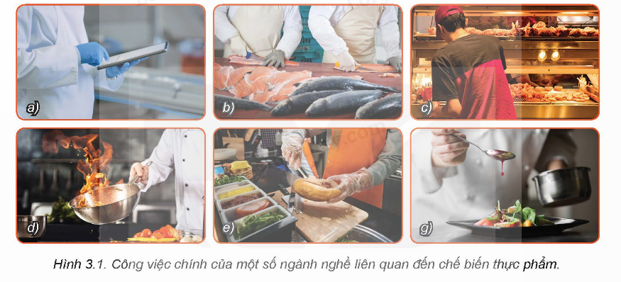 Hãy quan sát Hình 3.1 và cho biết, các công việc trong hình tương ứng với tên gọi nào sau đây: vận hành sản xuất tự động tại nhà máy thực phẩm; sơ chế, chế biến thực phẩm; chuẩn bị đồ ăn nhanh.