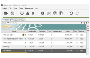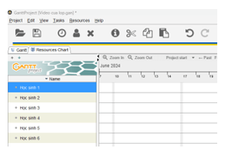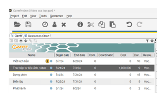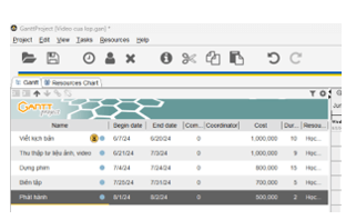Có nhiều công việc cần phải chuẩn bị cho lễ bế giảng, vì vậy lớp 12A1 chỉ có 6 học sinh tham gia vào dự án xây dựng video kỉ yếu. Bên cạnh đó, dự án cũng chỉ có một lượng kinh phí nhất định để thực hiện. Căn cứ danh sách nhiệm vụ và tiến độ dự kiến, ta trao đổi và sử dụng tính năng phân bổ nhân lực và phân bổ kinh phí để thực hiện cho từng nhiệm vụ của dự án.