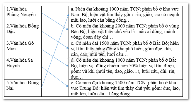 d. Có niên đại khoảng 1000 năm TCN: phân bố ở Bắc Bộ; hiện vật đồng chiếm hơn 50% hiện vật tìm được, gồm: vũ khí (mũi tên, dao, giáo…), lưỡi câu, dùi, rìu, đục… |