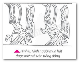 - Trong đó là các nhóm gồm người mặc áo lông chim đang nhảy múa, người giã gạo chày đôi, người đánh trống, nhà sàn mái cong, hươu đang đi cùng chim mỏ ngắn bay và chim mỏ dài đứng…
