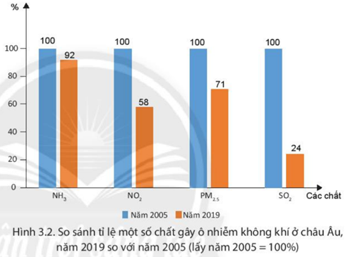 - Tỉ lệ một số chất gây ô nhiễm không khí ở châu Âu năm 2019 giảm rất nhiều so với năm 2005, cụ thể: