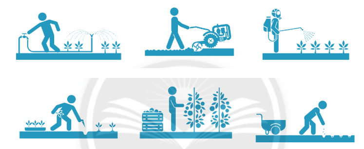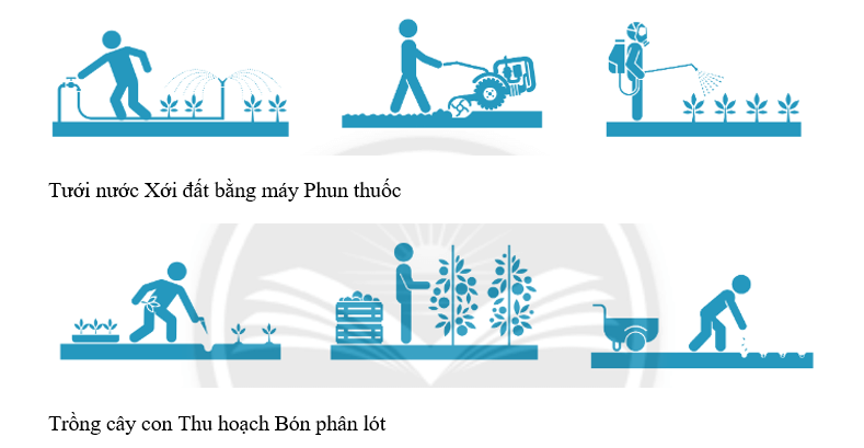 Quan sát các hình ảnh và điền tên công việc trong quy trình trồng trọt vào dưới mỗi hình