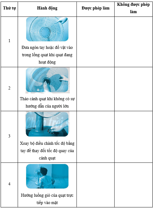 Em hãy chọn những hành động được phép làm và không được phép làm khi sử dụng quạt điện bằng các đánh dấu √ vào cột lựa chọn.