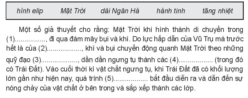 - Mặt Trời khi hình thành di chuyển trong dải Ngân Hà, đi qua đám mây bụi và khí. Do lực hấp dẫn của Vũ Trụ mà trước hết là của Mặt Trời, khí và bụi chuyển động quanh Mặt Trời theo quỹ đạo hình elip, dần dần ngưng tụ thành các hành tinh (trong đó có Trái Đất).