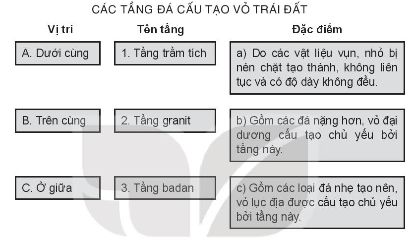 Nguồn gốc của Trái Đất liên quan chặt chẽ đến sự hình thành. Giới hạn của vỏ Trái Đất là. Đặc điểm nào sau đây không đúng với vỏ Trái Đất? Theo nguồn gốc, đá được phân chia thành ba nhóm là. Hãy sử dụng các cụm từ sau để hoàn thành đoạn văn dưới đây. Ghép ô ở giữa với ô bên trái và bên phải sao cho phù hợp. Ghép ô bên trái với ô bên phải sao cho phù hợp. Trình bày sự khác biệt giữa vỏ lục địa và vỏ đại dương.