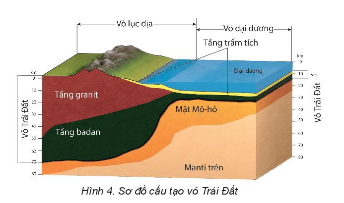 Quan sát hình 4 trang 16 SGK địa lý 10 và khái niệm vỏ Trái Đất
