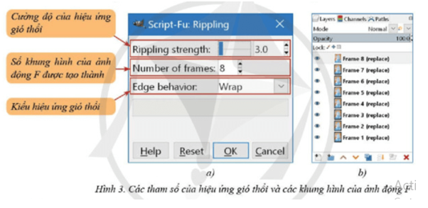 Chọn lớp ảnh “Basic2.jpg” và thực hiện lệnh Ripping từ bảng chọn Filters\Animaton để áp dụng hiệu ứng gió thổi cho ảnh. Trong hôp thoại Script-Fu: Ripping xuất hiện sau đó, thiết đặt các tham số như hình 3a. Trong đó, giá trị của tham số cường độ của hiệu ứng gió thổi càng cao thì mức độ dao động của các điểm ảnh lớn. Ảnh động F được tạo với các khung hình như 3b.