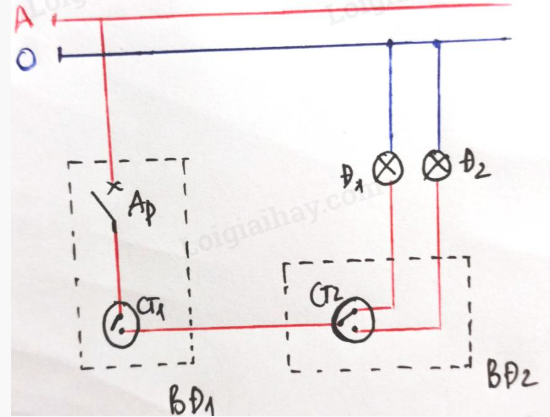 Hãy thiết kế sơ đồ nguyên lí, sơ đồ lắp đặt mạng điện gồm: nguồn điện, aptomat, công tắc hai cực và bóng đèn, trong đó công tắc bật tắt bóng đèn và aptomat bảo vệ mạng điện.