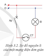 Hãy thiết kế sơ đồ nguyên lí của một mạng điện đơn giản gồm một aptomat, một ổ cắm và một công tắc điều khiển một đèn.