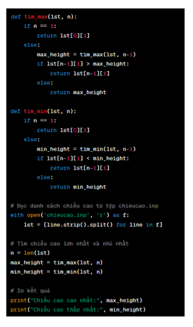 Đầu tiên, ta đọc danh sách chiều cao từ tệp chieucao.inp. Tiếp theo, ta sử dụng hàm đệ quy để tìm chiều cao lớn nhất và nhỏ nhất.