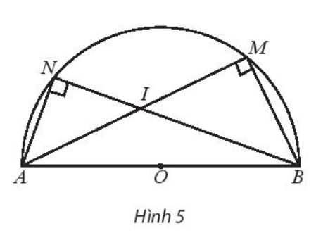 Cho nửa đường tròn tâm O có đường kính \(AB = 2R\). Gọi M và N là hai điểm thuộc nửa đường tròn sao cho AM và BN cắt nhau tại I như hình 5.
