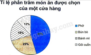Vì \(45\% > 25\% > 18\% > 12\% \), do đó ta thấy món phở được chọn là nhiều nhất ở cửa hàng.
